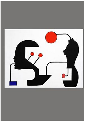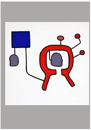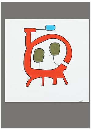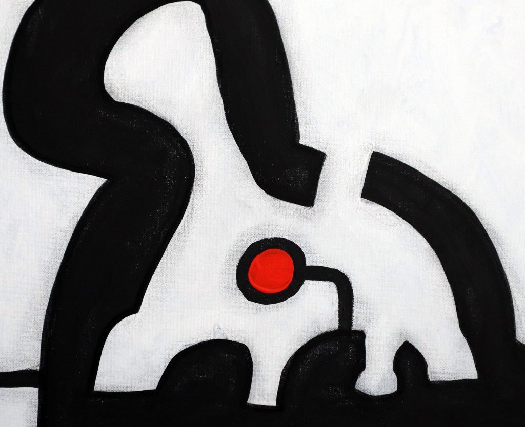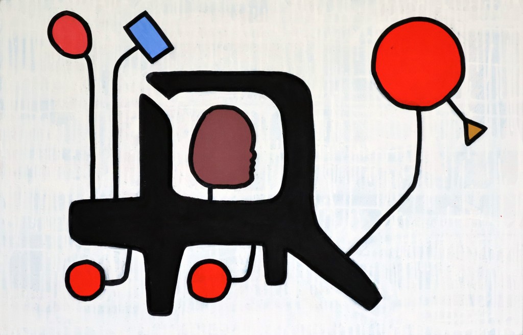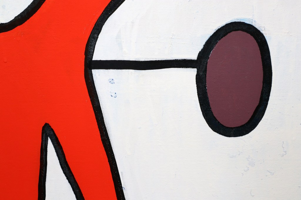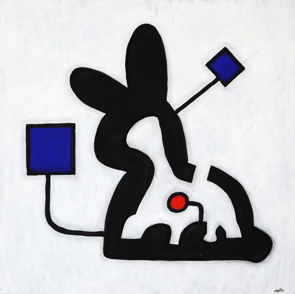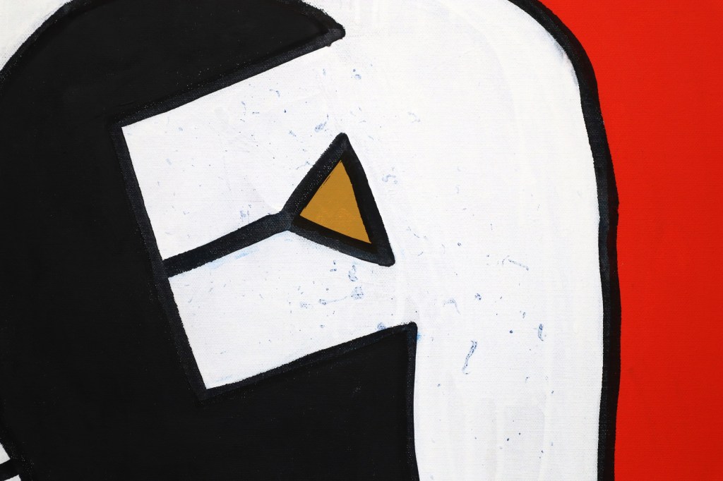 The work fuses bold abstract forms with sharp contrasts of color, balancing organic silhouettes against structured geometry. Its graphic intensity and enigmatic composition invite multiple readings—part totem, part human presence—positioning it squarely within Martin’s ongoing exploration of contemporary identity and visual codes.